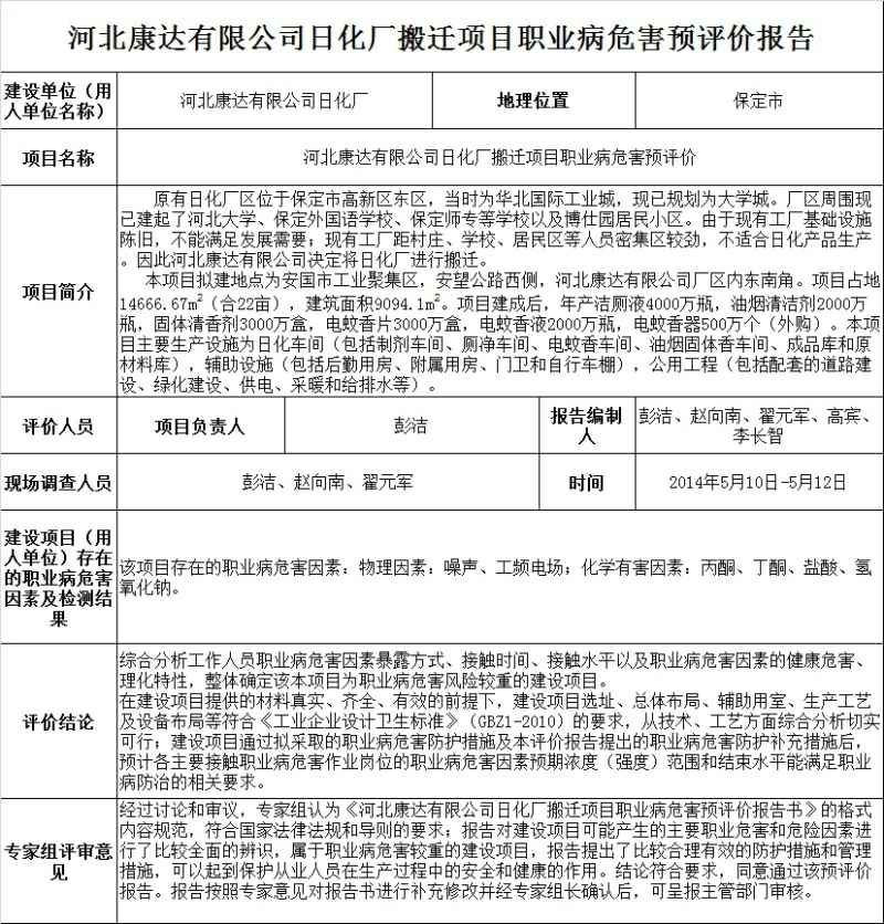 河北康达有限公司日化厂搬迁项目职业病危害预评价
